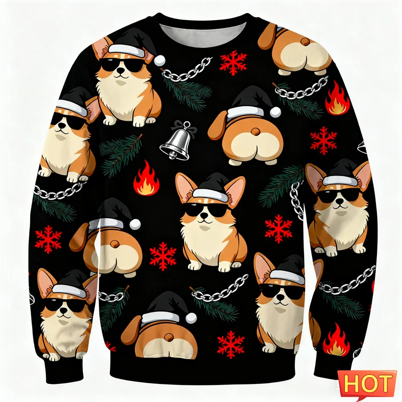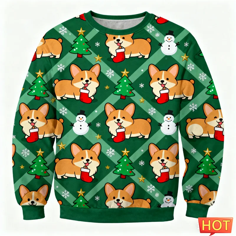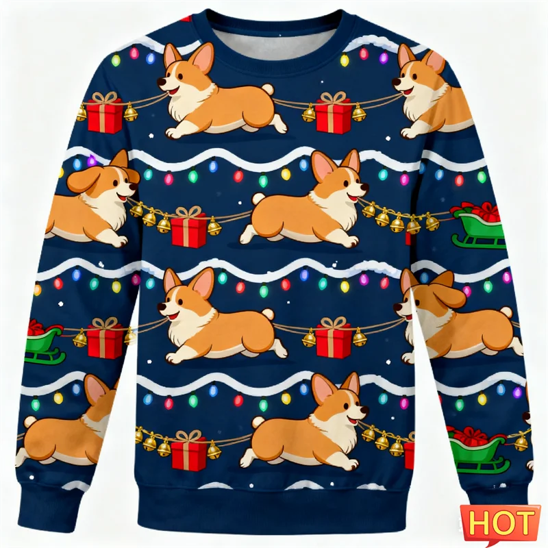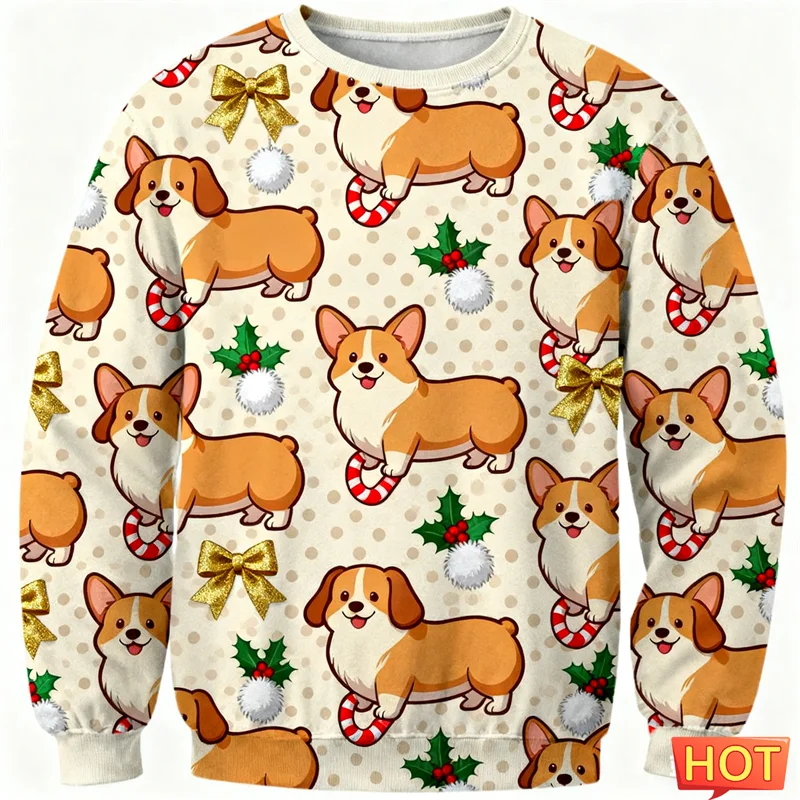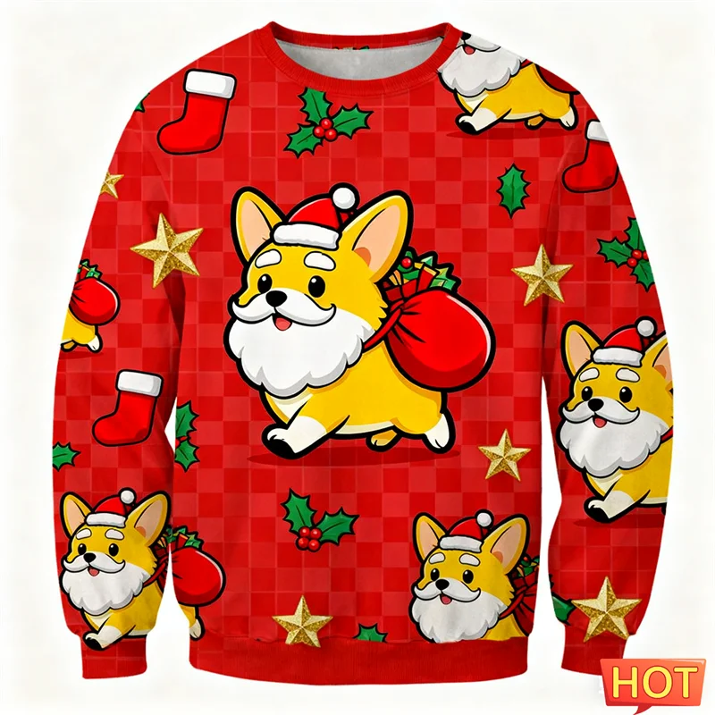 Cute Corgi Graphic Ugly Christmas Sweater For Men Trendy Crew Neck Dog 3D Printed Sweatshirts Loose Breathable Pullovers Tops